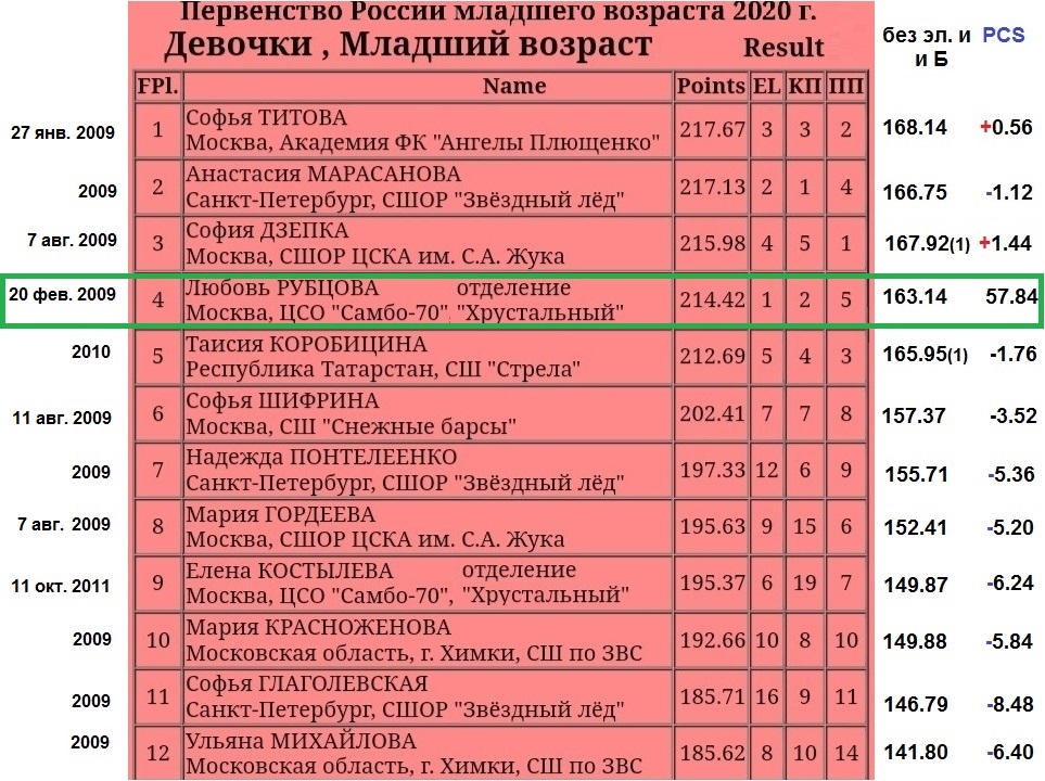 О Рубцовой же скажу так - за сезон в Хрустальном она выросла больше, чем на голову. В ноябре 2019 на Мемориале Волкова - КП/ПП 139.75, на Первенстве Москвы в январе 2020 - 196.22 в трёх дисциплинах, ныне 214.42(+18.20) в трёх дисциплинах, в КП/ПП +23.39 к Мемориалу Волкова.